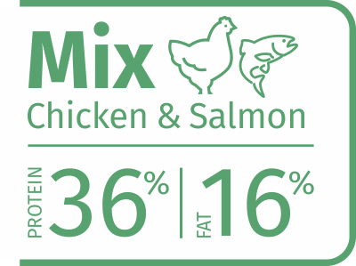 Dehydrated Chicken Meat (42%), Chicken Fat (6%), Chicken Liver Oil (5%), Dehydrated Salmon Protein (10%), Salmon Oil (5%), Anchovy Meal, Shrimp Powder, Brewers Dried Yeast, Anchovy Oil, Nucleotide Yeast Protein, Multivitamins & Minerals, Maize, Seaweed, Prebiotic Mannan Oligosaccharides (MOS), Yucca Extract, Cranberry Powder, Baldo Rice, Psyllium.